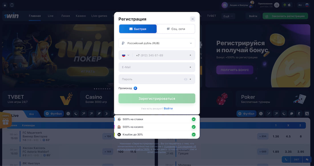 Надежная букмекерская контора и казино 1вин щедро вознаграждает новых пользователей, предлагая им выгодный бонус за регистрацию. Чтобы его получить, необходимо ввести промокод во время заполнения регистрационной формы. Найти актуальный промокод вы всегда можете на нашем сайте либо получить его в тематических рассылках, на специализированных форумах или в других проверенных источниках.